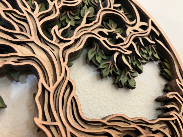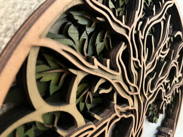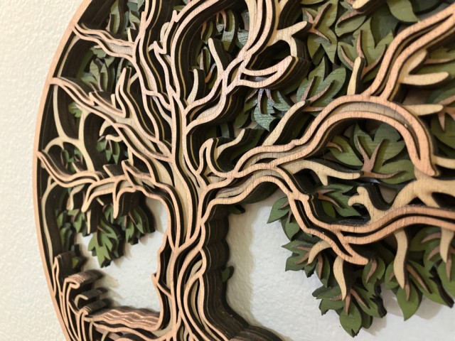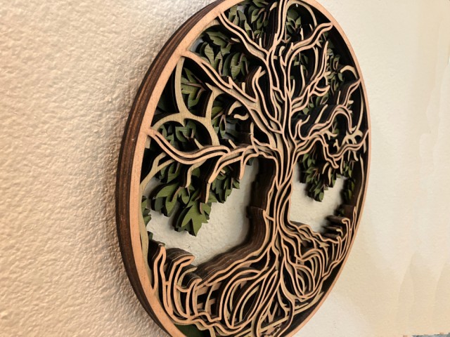 Muylti-layered wooden Tree of Life Wall art. Features multiple crafted layers that come together to form the iconic tree of life. Each layer designed to add depth and dimension resulting in a stunning three dimensional effect that comes to life. Six separate layers in all! Measures about 12 inches in diameter and about 7/8" thick.