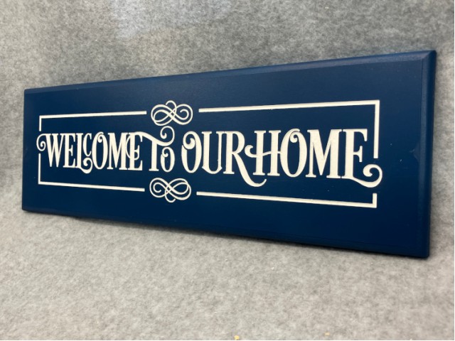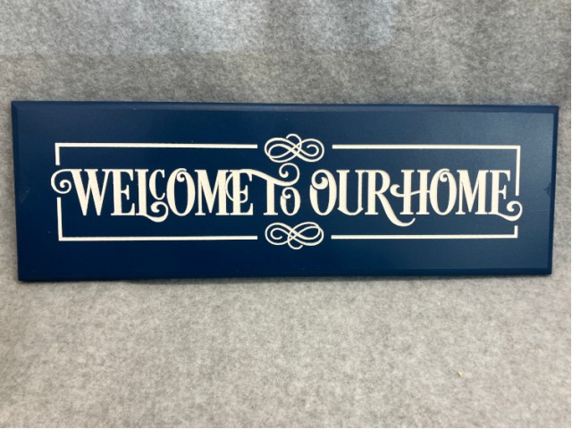 “Welcome to our Home”. Pretty calligraphy carved into blue painted PVC making it perfectly suitabe to hang outside. Approximately 16-1/2″ X 5-1/2″.