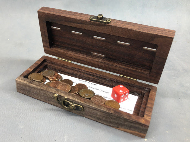 Super simple to play but still a lot of fun! Great game to play with the little ones. They just need to recognize their numbers. Object of the game is simple. Be the first to get rid of all your pennies. Start off with about a dozen pennies each. Roll the die and place a penny on that number (if you get a 6 the penny falls right through and disappears). If you roll a number that's already occupied you have to take ALL the pennies on the board. Full instructions are included with the game. Box opens to hold about 50 pennies, a die, and instructions. Clasp on the front keeps it closed. Small parts included in the game so use with supervision when younger children are playing. Comes with 24 pennies to get you started.